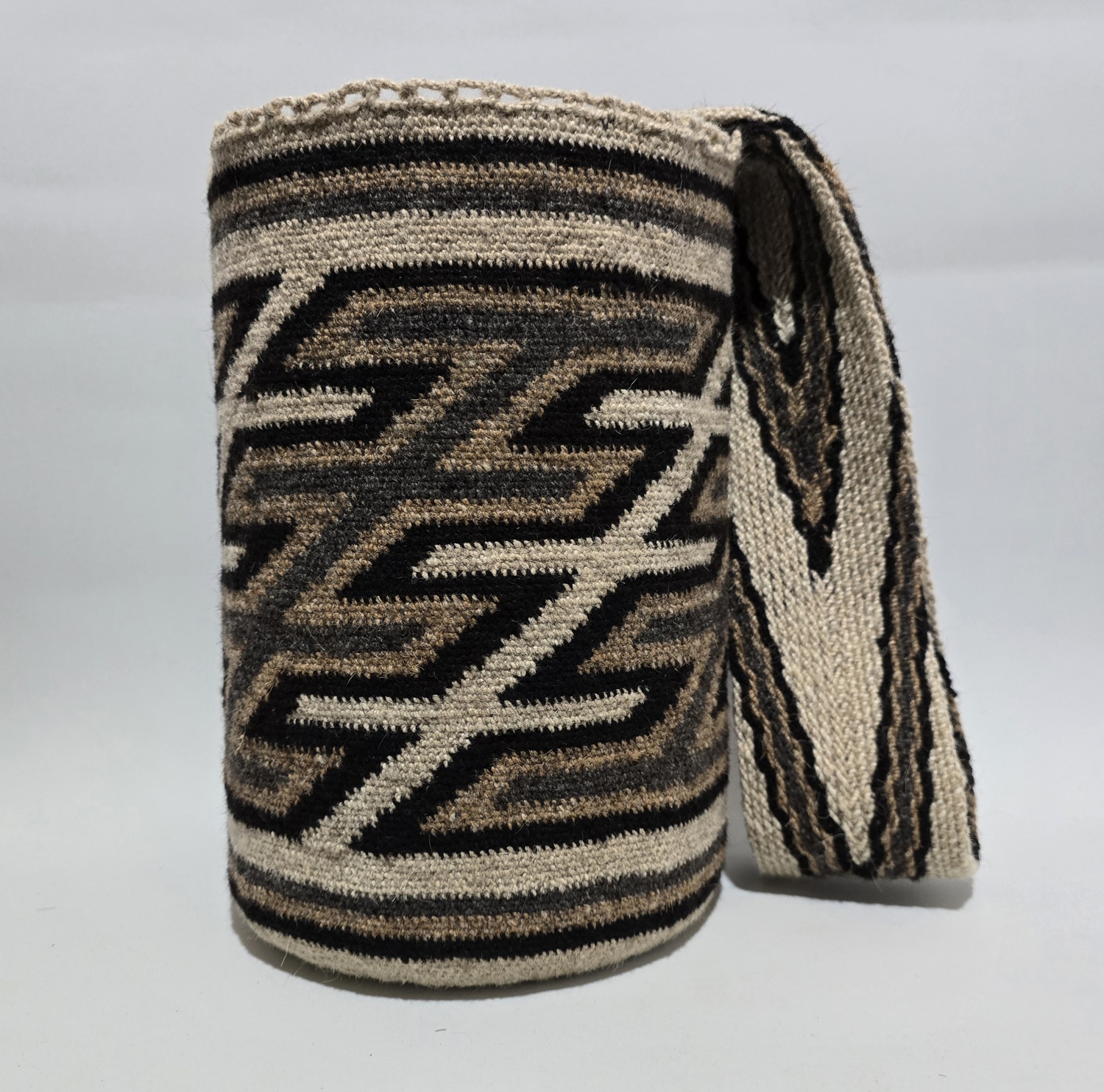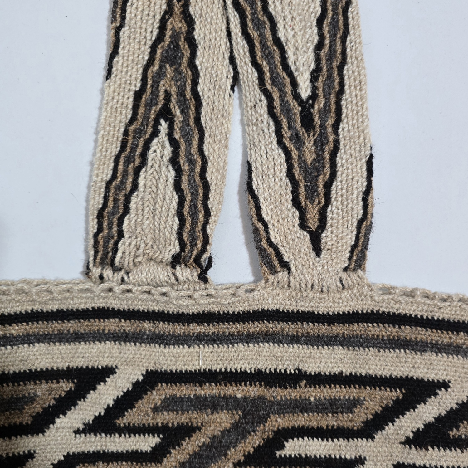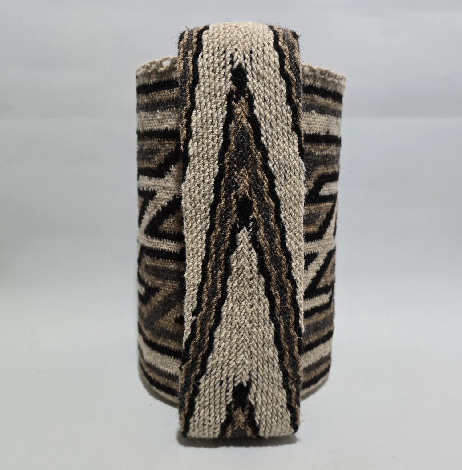 La mochila arhuaca JWACHWU, tejida en lana de ovejo, es una obra artesanal que guarda el profundo simbolismo de la sabiduría ancestral de la Sierra Nevada.