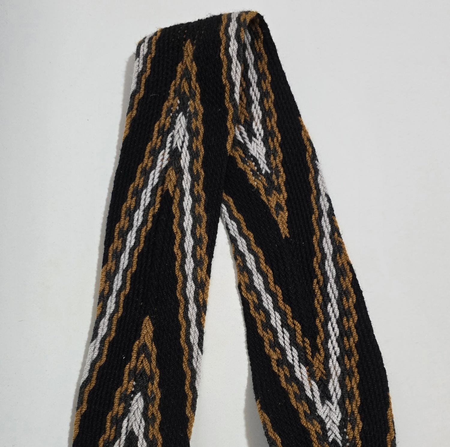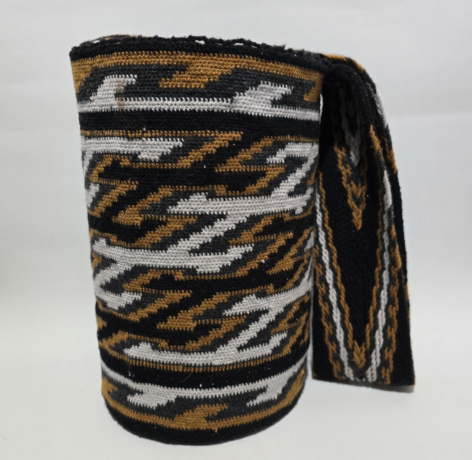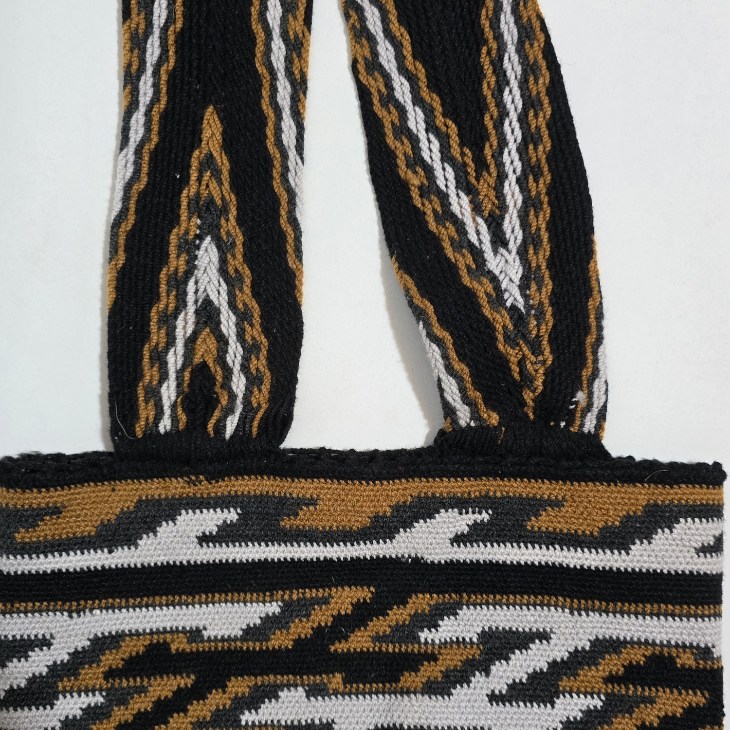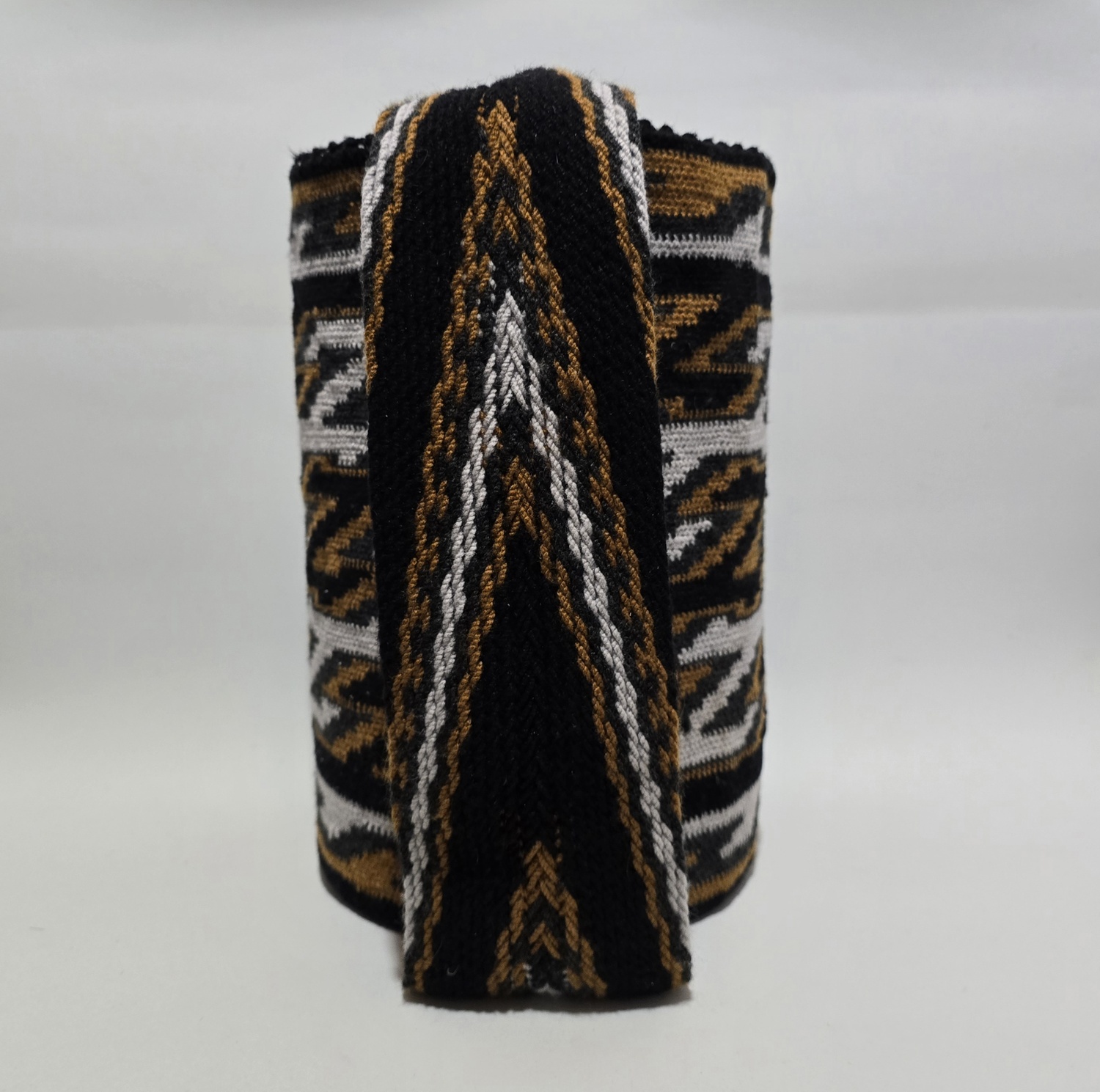 La mochila arhuaca JWACHWU, tejida en lana de alpaca, es una obra artesanal que guarda el profundo simbolismo de la sabiduría ancestral de la Sierra Nevada.