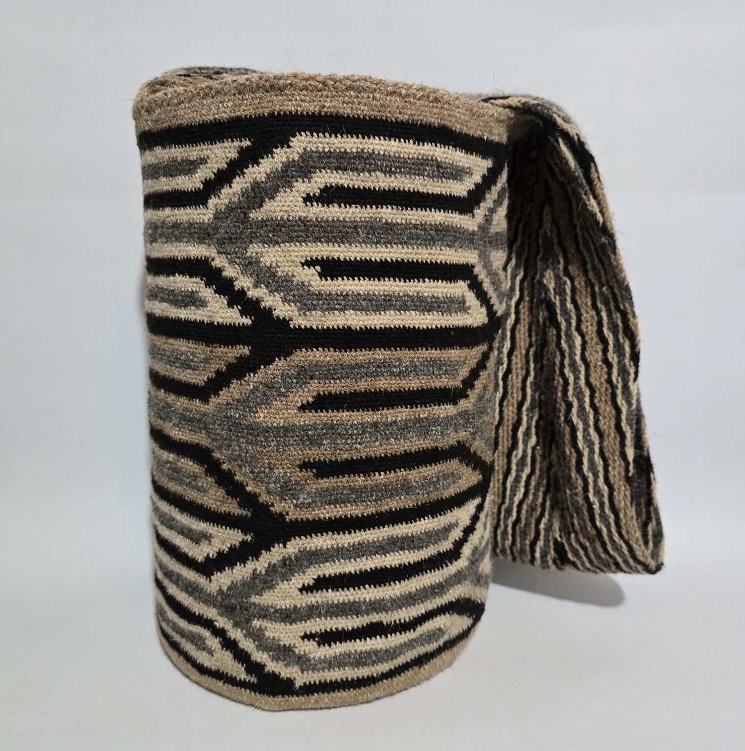 La mochila arhuaca KUNZACHU, tejida en lana de ovejo, es una obra artesanal cargada del profundo simbolismo de la sabiduría ancestral.