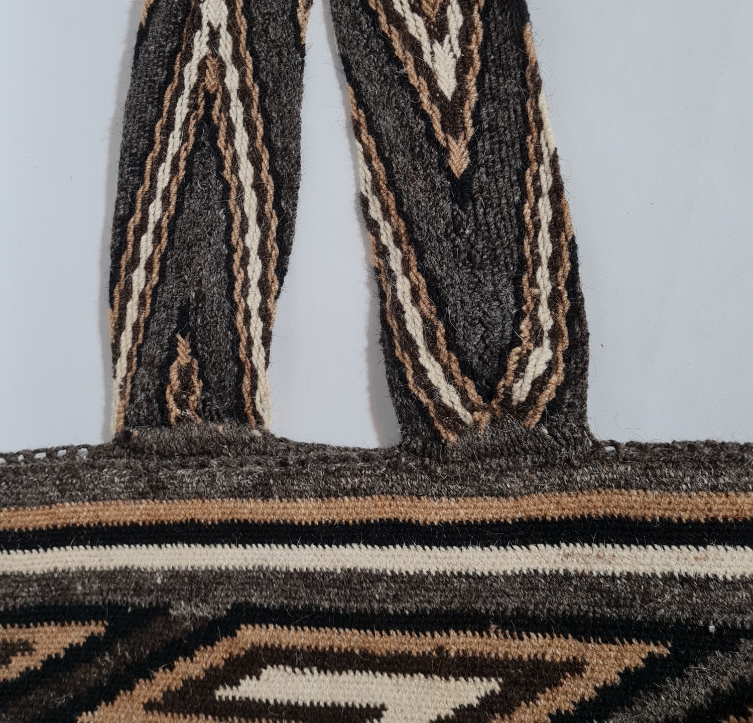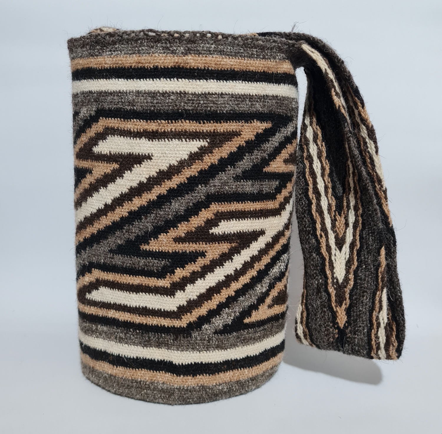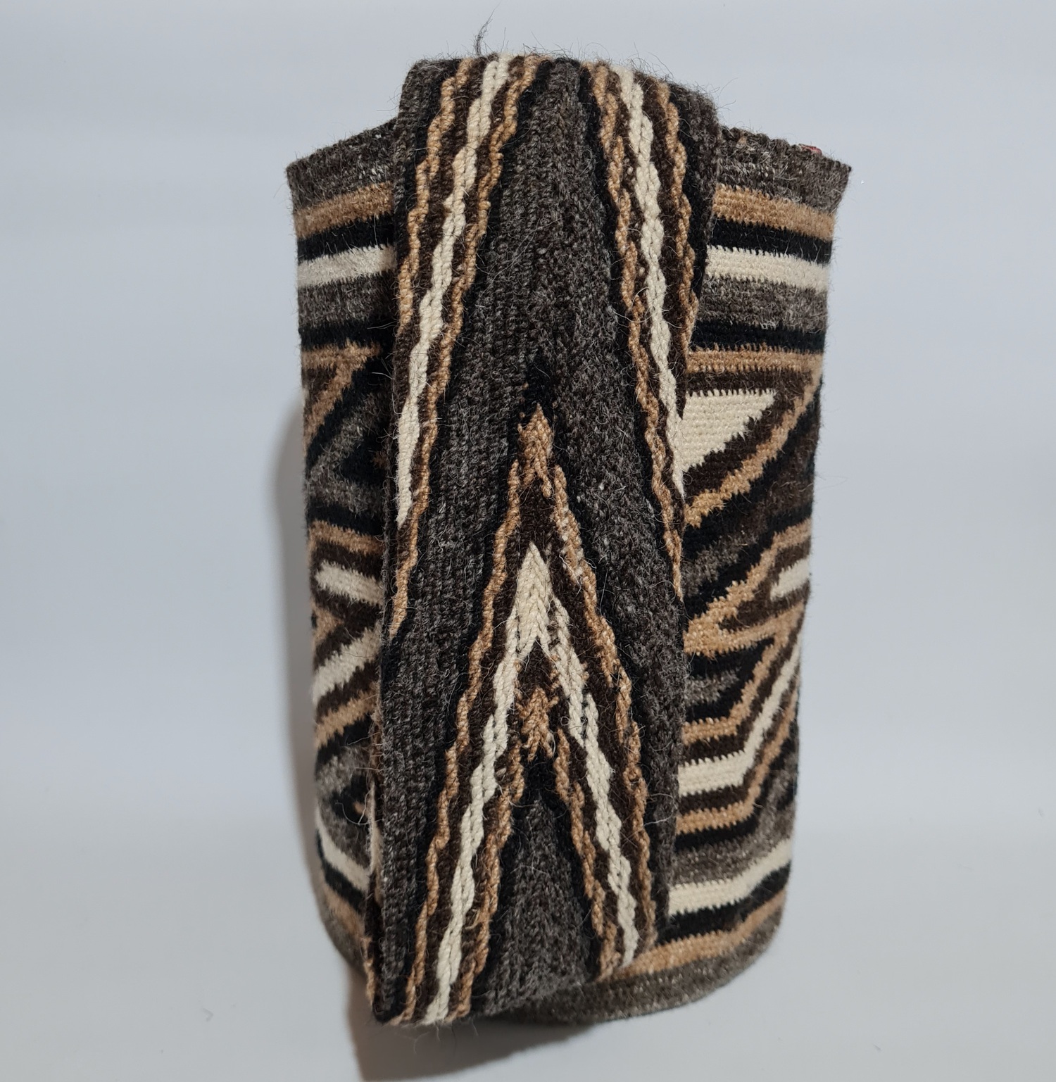 La mochila arhuaca JWACHWU, tejida en lana de ovejo, es una obra artesanal que guarda el profundo simbolismo de la sabiduría ancestral de la Sierra Nevada.