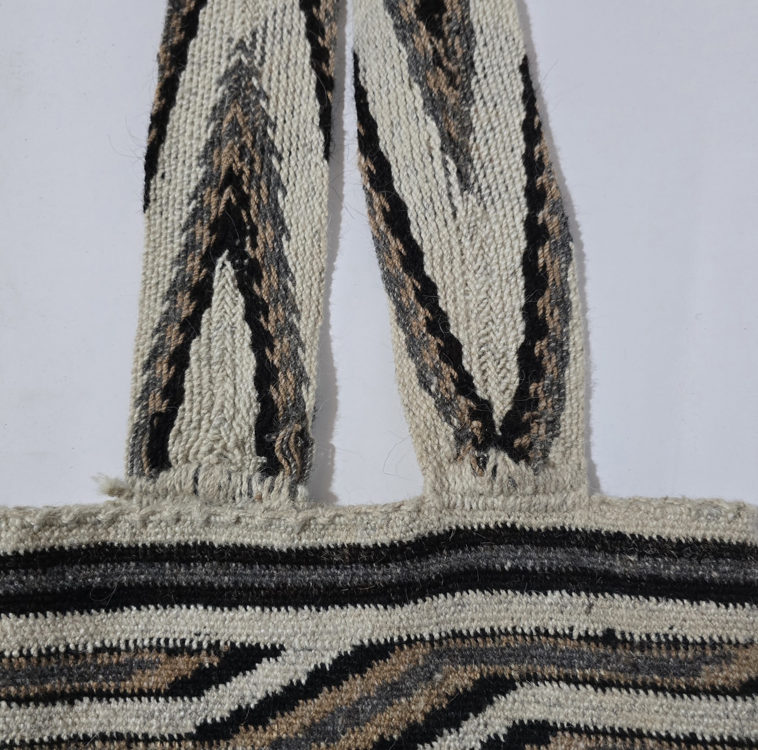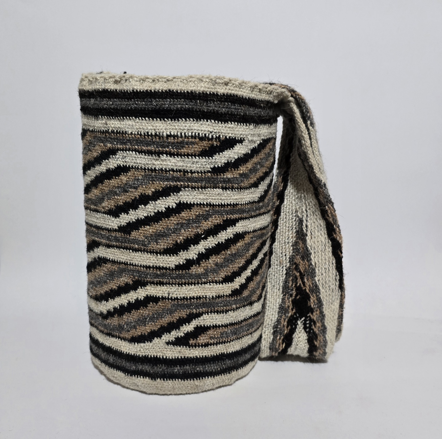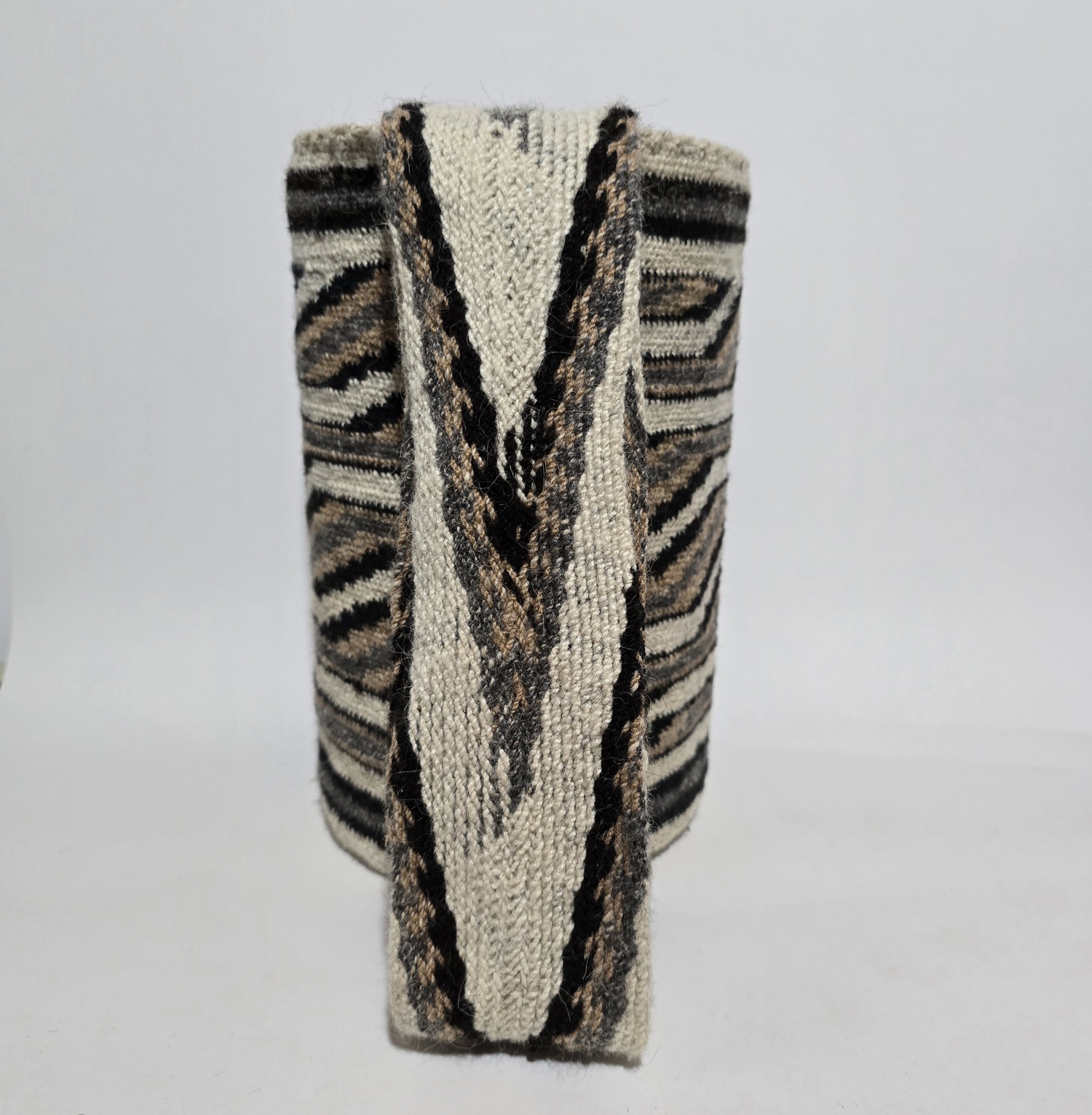 La mochila arhuaca Kunsumunu A’mia, tejida en lana de ovejo, es una obra artesanal que lleva consigo el profundo simbolismo de la sabiduría ancestral.